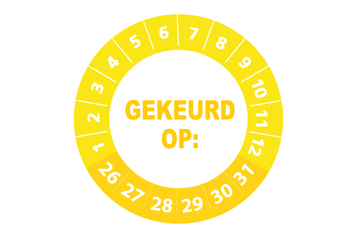Deze keuringsstickers hebben een diameter van 3 cm en worden geleverd met een UV beschermlaag. Ze zijn daarom ook geschikt voor outdoor gebruik en kunnen prima tegen een stootje. Heeft u speciale wensen? Bel of mail dan gerust voor een offerte op maat!