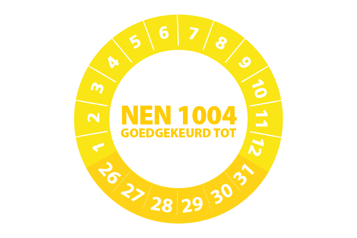 Bestel hier uw ‘NEN 1004 goedgekeurd tot 2026 keuringsstickers op makkelijk hanteerbare rollen.