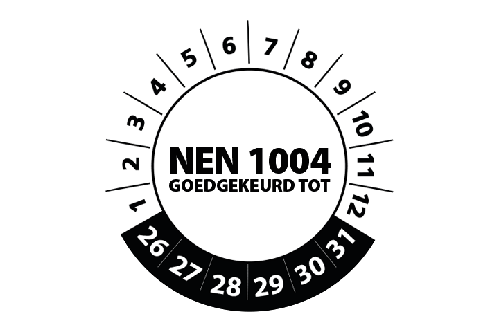 Bestel hier uw ‘NEN 1004 goedgekeurd tot 2026’ keuringsstickers op makkelijk hanteerbare rollen.