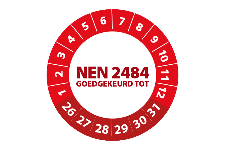 Bestel hier uw ‘NEN 2484 goedgekeurd tot 2026’ keuringsstickers op makkelijk hanteerbare rollen.